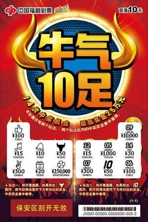 主题大气,朗朗上口,可作为在牛年上市的畅销票种进行推广;双玩法中刮出“  ” “ ”分别与主题中的“牛”字“10”字巧妙呼应,玩法区布局清晰,简单有趣。