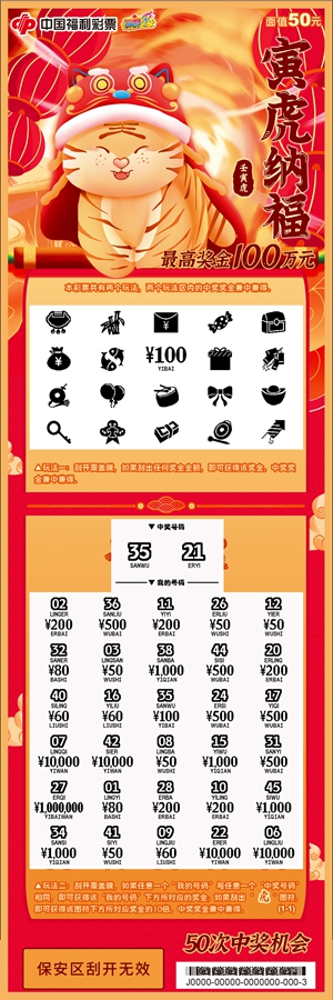 玩    法:本彩票共有两个玩法,两个玩法区内的中奖奖金兼中兼得。玩法一:刮开覆盖膜,如果刮出任何奖金金额,即可获得该奖金。中奖奖金兼中兼得。玩法二:刮开覆盖膜,如果任意一个“我的号码”与任意一个“中奖号码”相同,即可获得该“我的号码”下方所对应的奖金;如果刮出“”图符,即可获得该图符下方所对应奖金的10倍。中奖奖金兼中兼得。