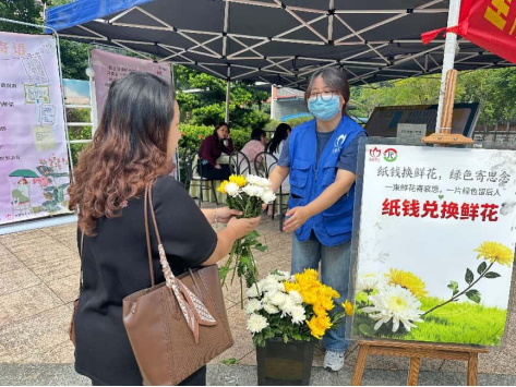 今年清明节期间,市殡仪馆社工开展“纸钱兑换鲜花”活动