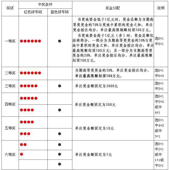 一等奖:7个号码相符(6个红色球号码和1个蓝色球号码)(红色球号码顺序不限,下同)