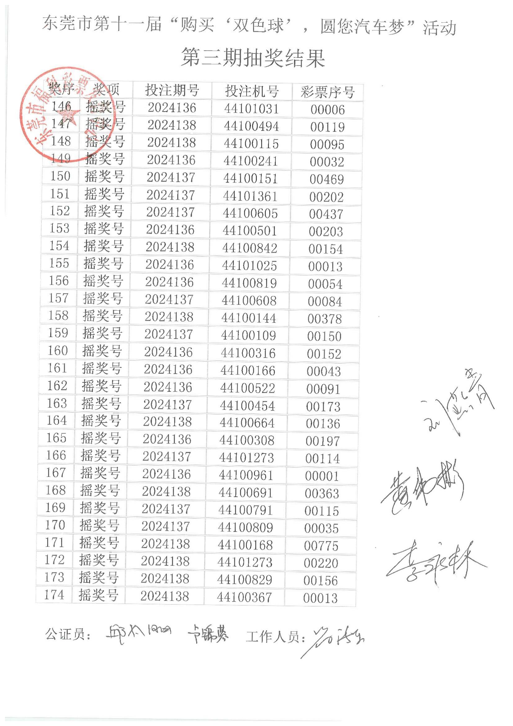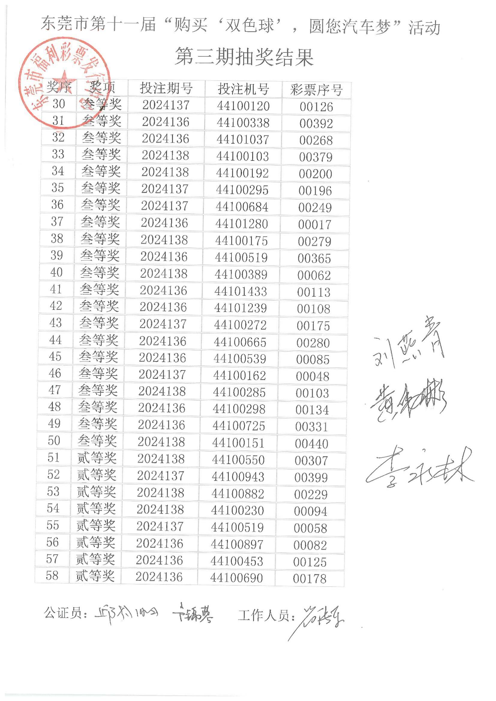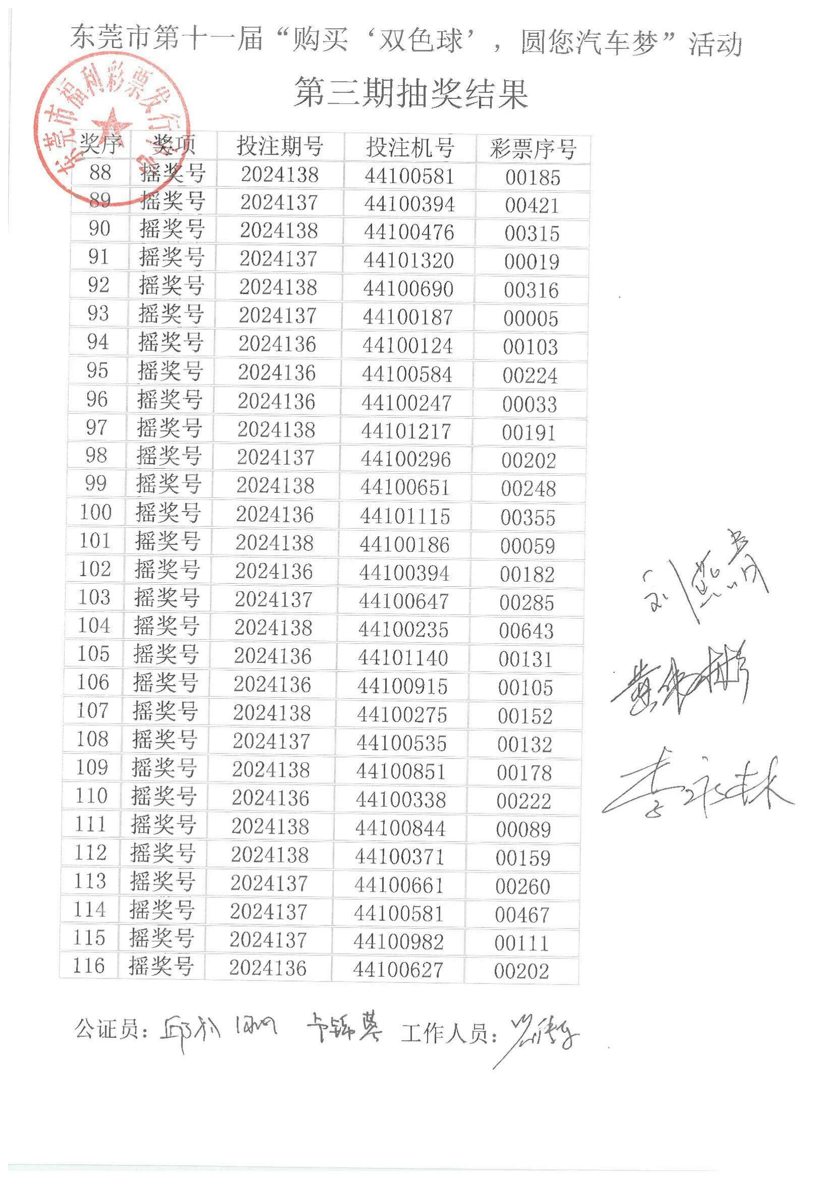 东莞市第十一届“购买‘双色球’,圆您汽车梦”活动第三期抽奖结果