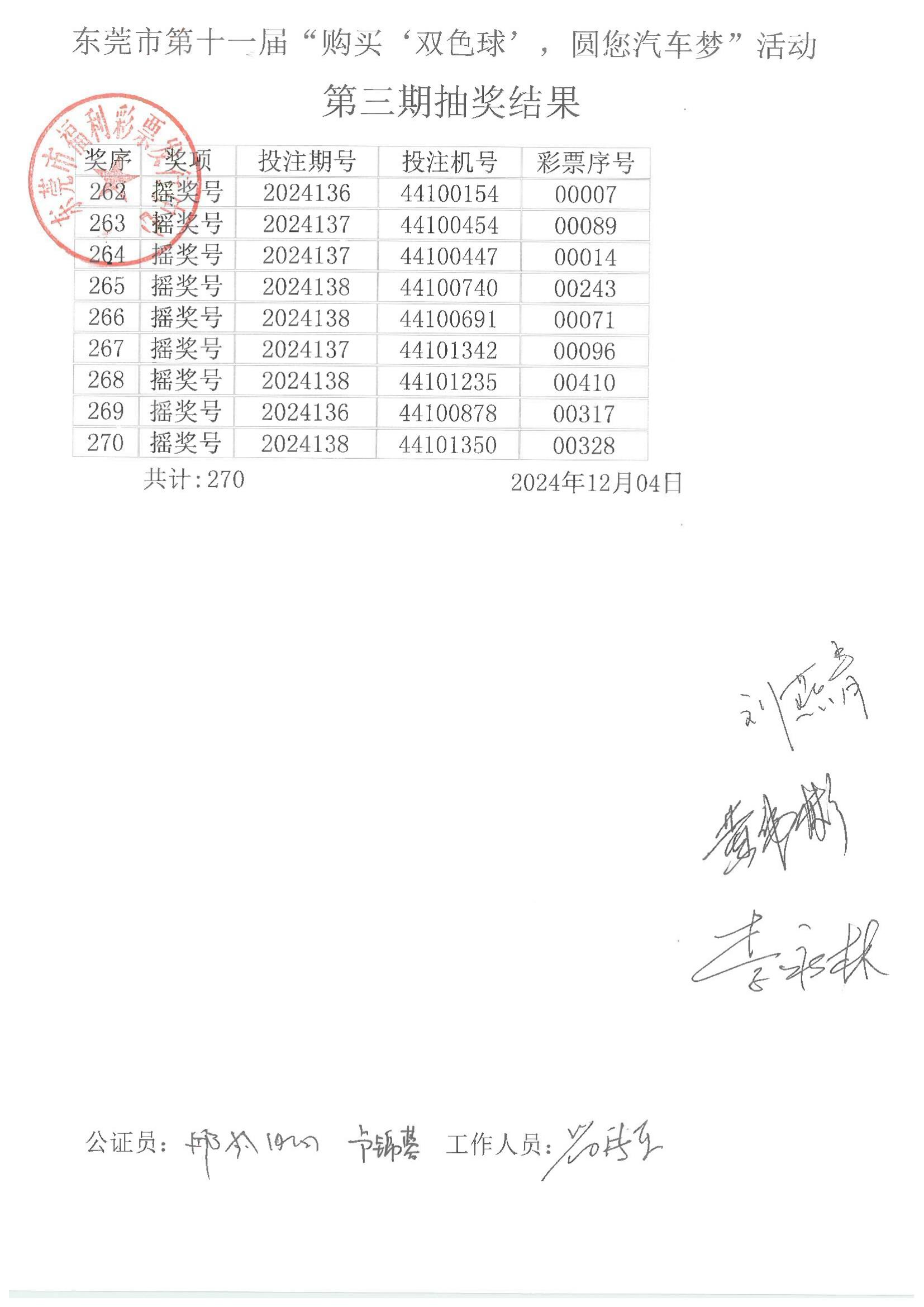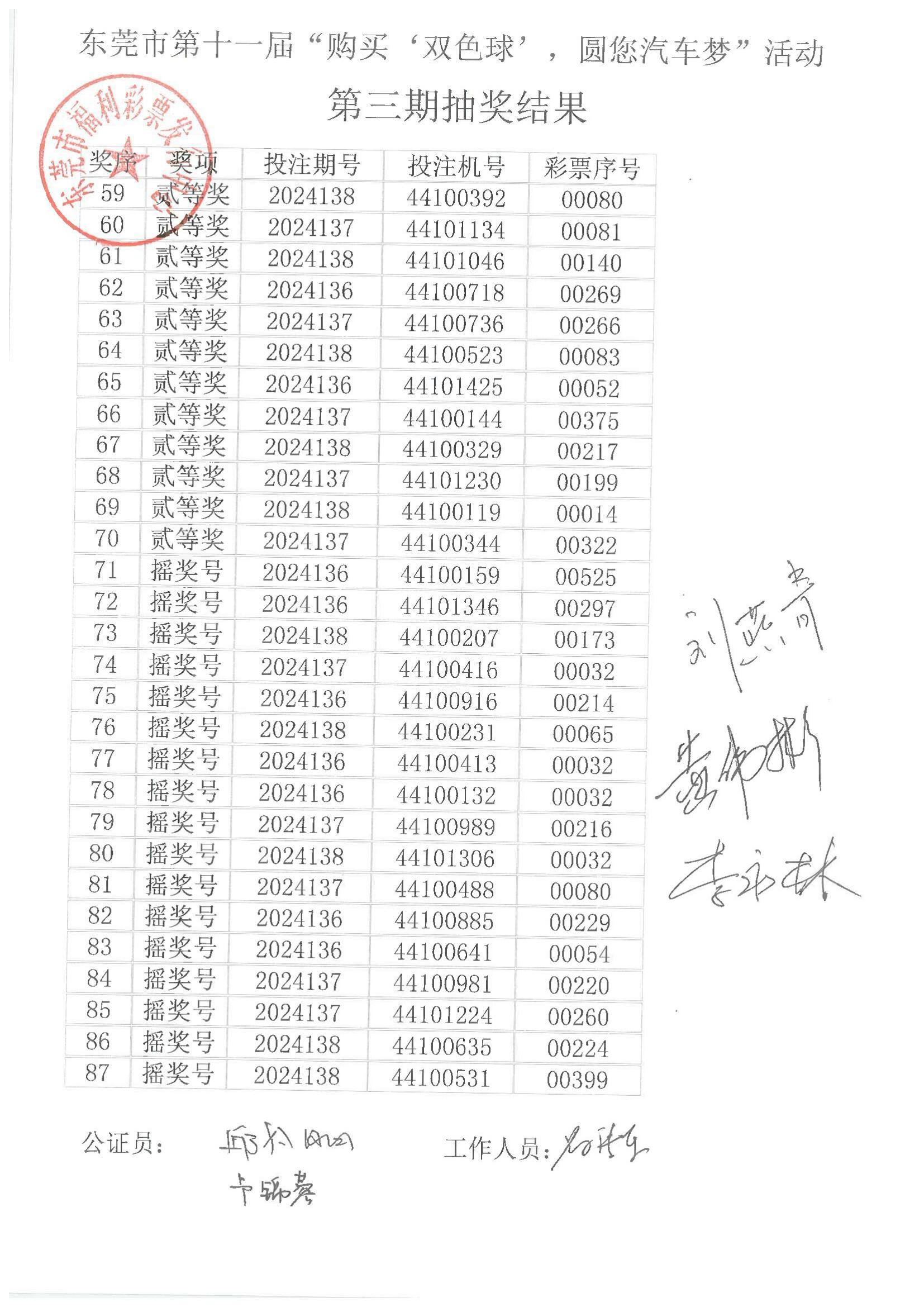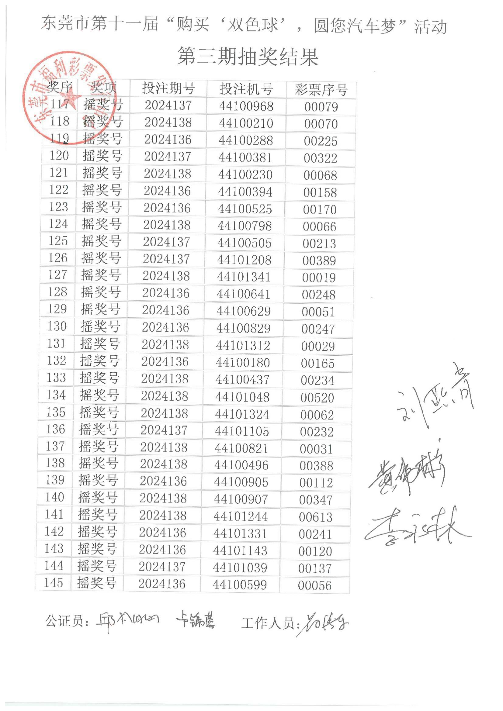 东莞市第十一届“购买‘双色球’,圆您汽车梦”活动第三期抽奖结果