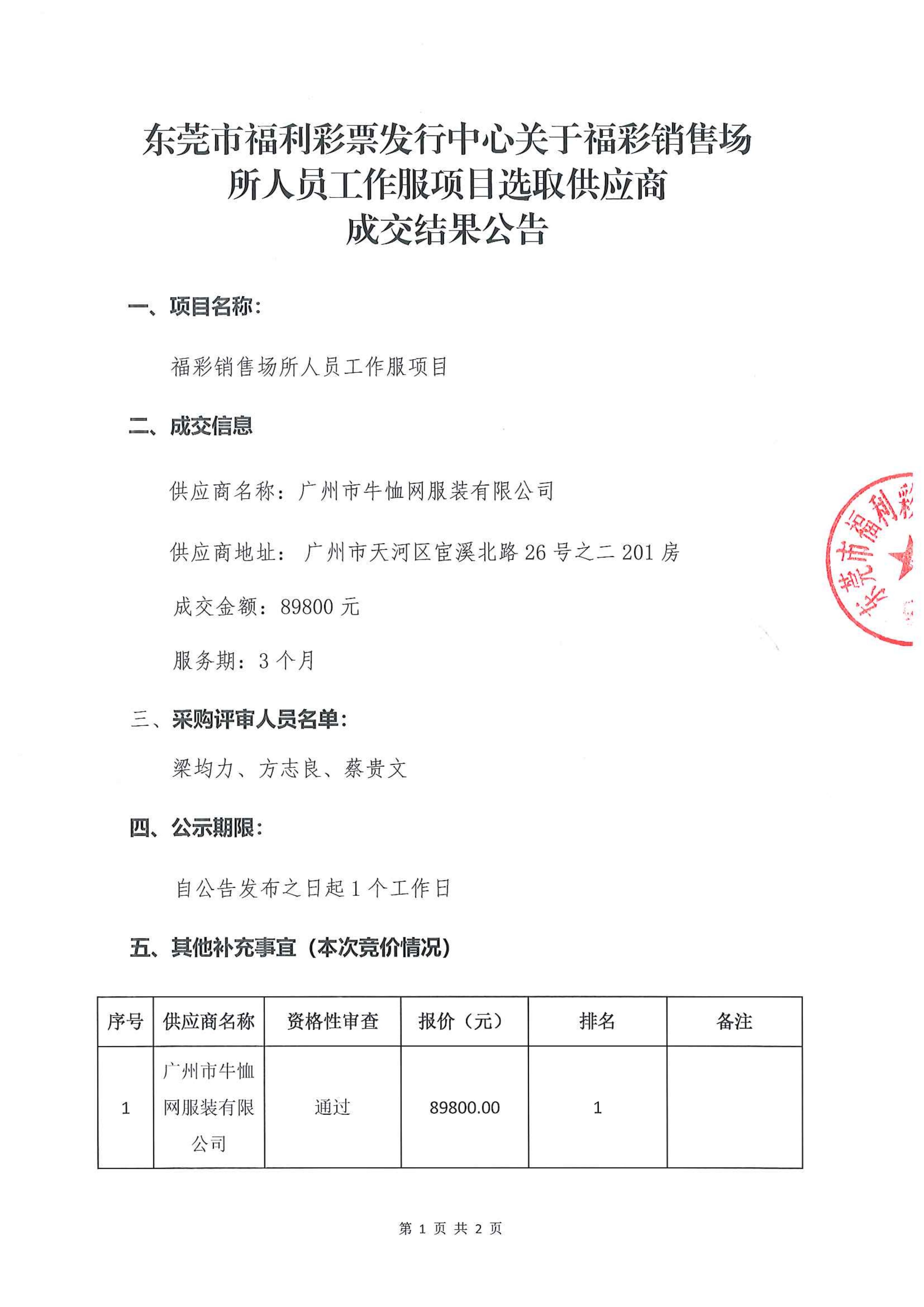 东莞市福利彩票发行中心关于福彩销售场所人员工作服项目选取供应商成交结果公告