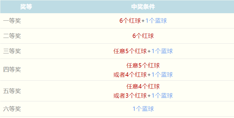 投注号码与当期开奖号码中的任意4个红色球号码相同,或与任意3个红色球号码和1个蓝色球号码相同,即中奖;