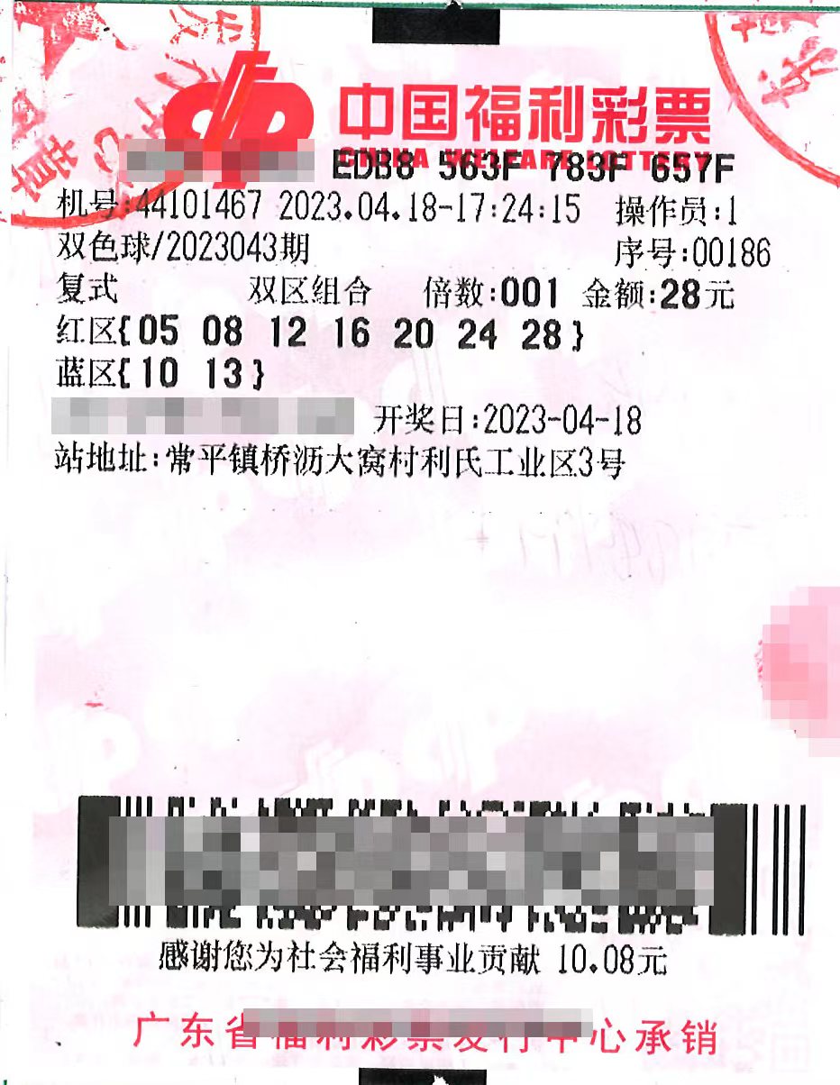 418日晚中国福彩双色球第2023043期开奖当期开奖号码为红球050812202428,蓝球:10。当期一等奖全国开出19注,天津1注,上海2注,浙江3注,安徽5注,福建1注,重庆1注,广东4注,广西1注,贵州1注,单注奖金590万多元。经检索,当期广东中出的其中1注花落东莞。东莞市常平镇桥沥大窝村利氏工业区3号44101467销售网点凭借一张7+2复式自选票中出602万多元双色球大奖。